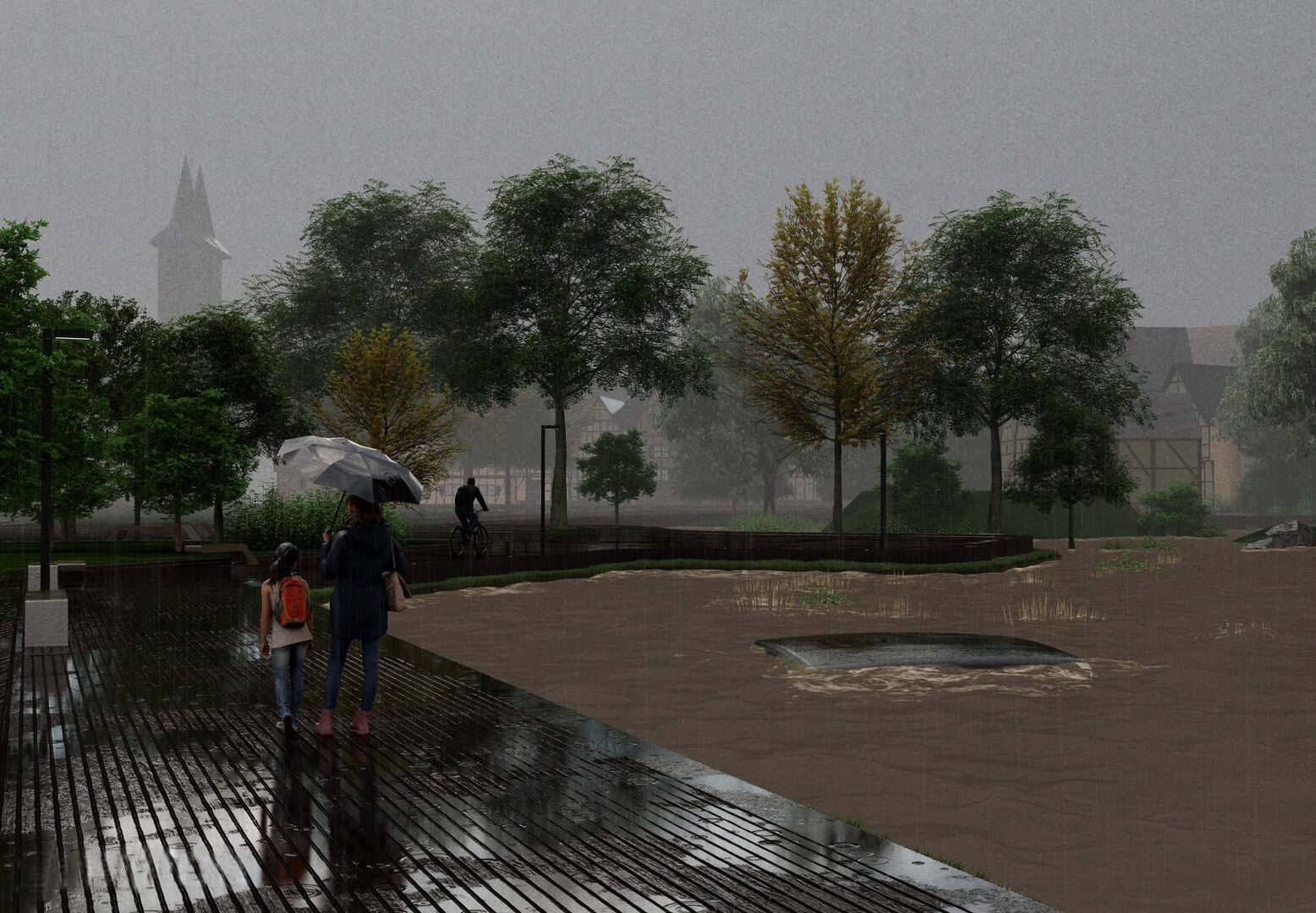 With emissions rising and global temperature increases, Quedlinburg is now experiencing the destructive effects of climate change. The city has already been experiencing major flooding due to climate conditions. Only 25% of the project site has unsealed surfaces. Problems will continue if the city does not manage it's storm water.